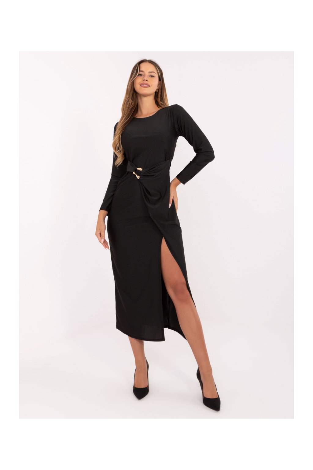 Úzký pouzdrový střih je ozvláštněn efektním nařasením, které lichotí křivkám a dodává modelu dynamiku. Top s kulatým výstřihem a dlouhými rukávy působí elegantně a nadčasově. Dominantním prvkem je nařasení v pase doplněné výraznou zlatou sponou, která šatům dodává exkluzivní akcent.