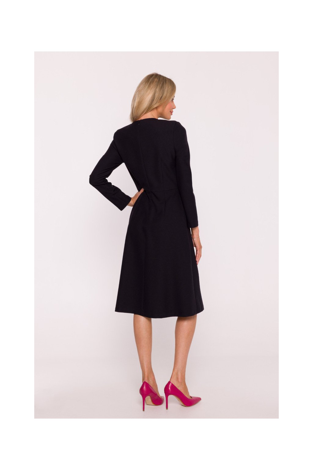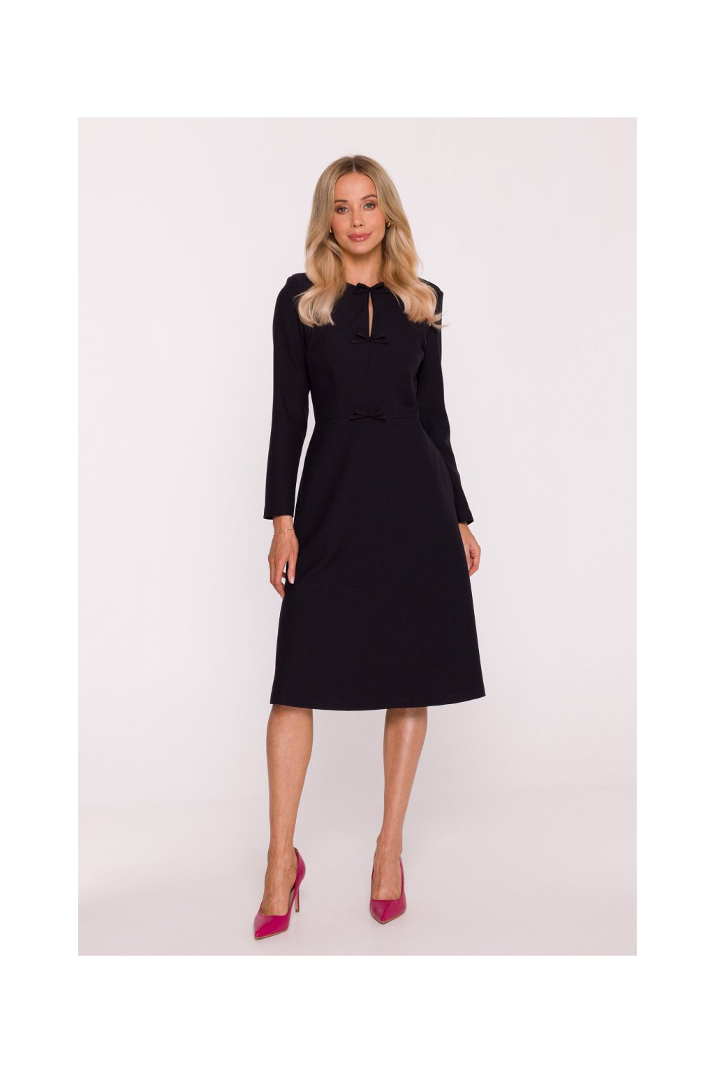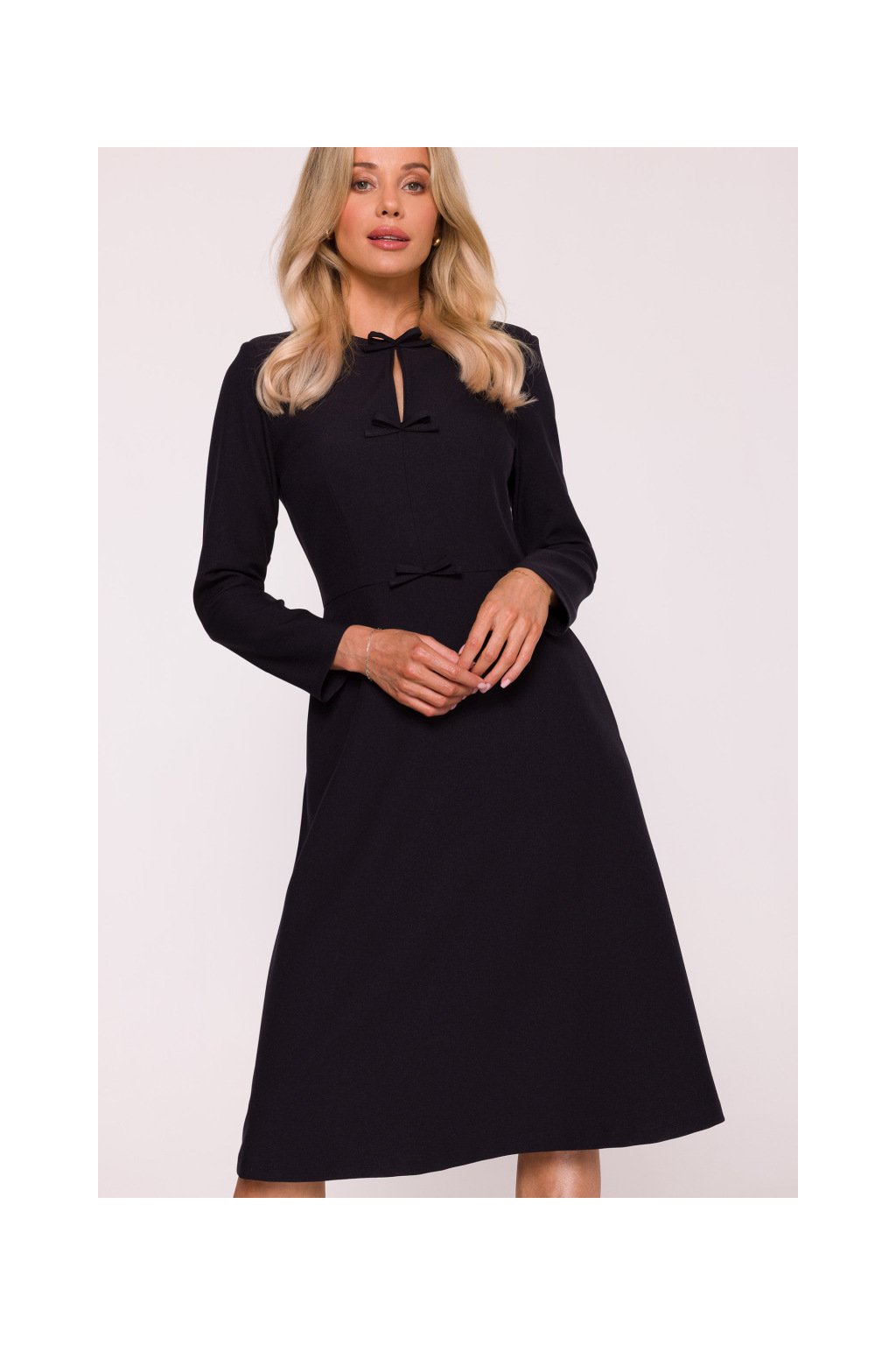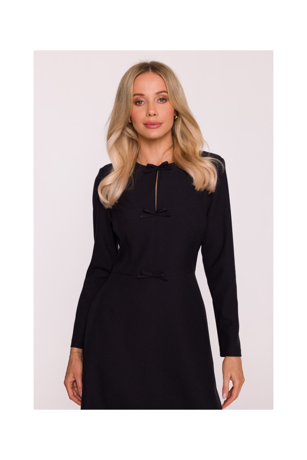 Elegantní šaty v trapézovém střihu představují dokonalou kombinaci pohodlí a stylu. Tvarovaný top je zdobený jemnými mašličkami na přední části, které dodávají šatům ženský a romantický nádech. Dlouhé rukávy zajišťují eleganci a vhodnost pro chladnější dny.