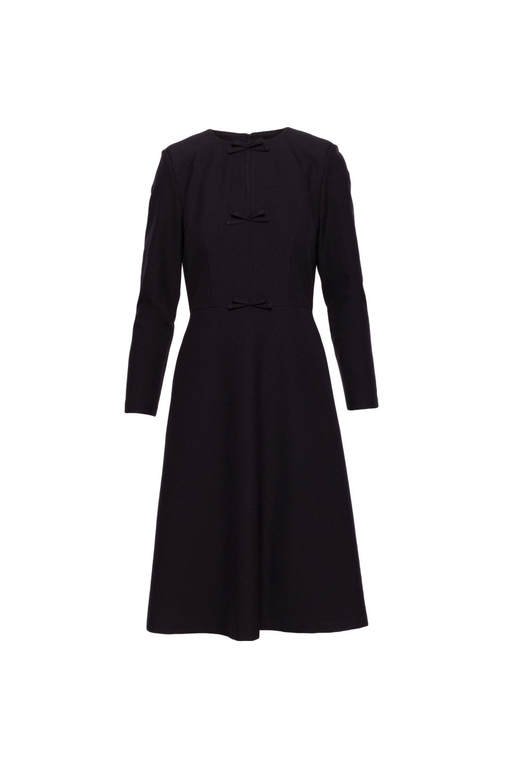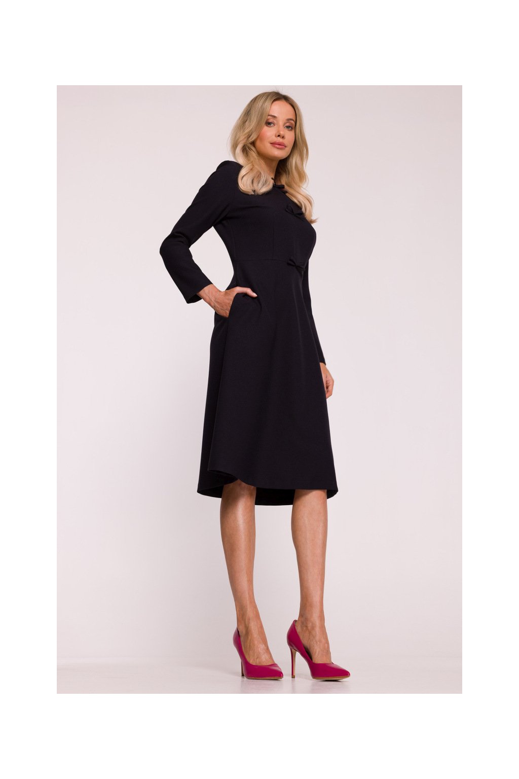 Elegantní šaty trapézového střihu, tvarovaný top s ozdobnými mašličkami vpředu, dlouhým rukávem, pase přestřižené, zapínání na skrytý zip na zádech. Áčková zvlněná vzdušná sukně, v postranních švech skryté kapsy. Hladký materiál s melírovanou strukturou. Bez podšívky.