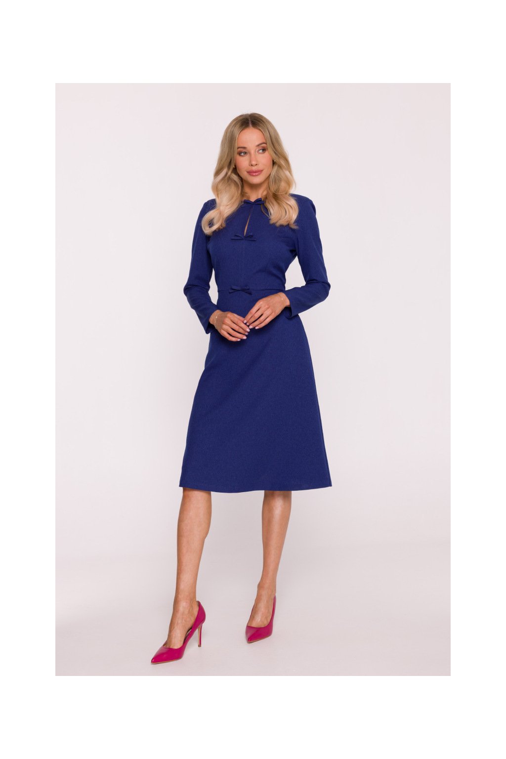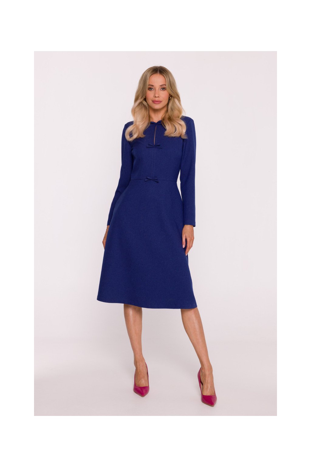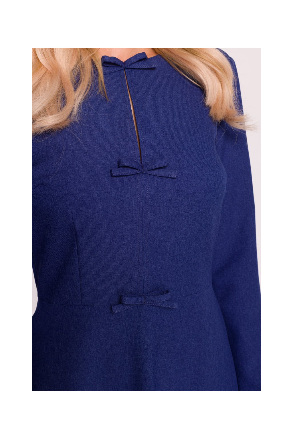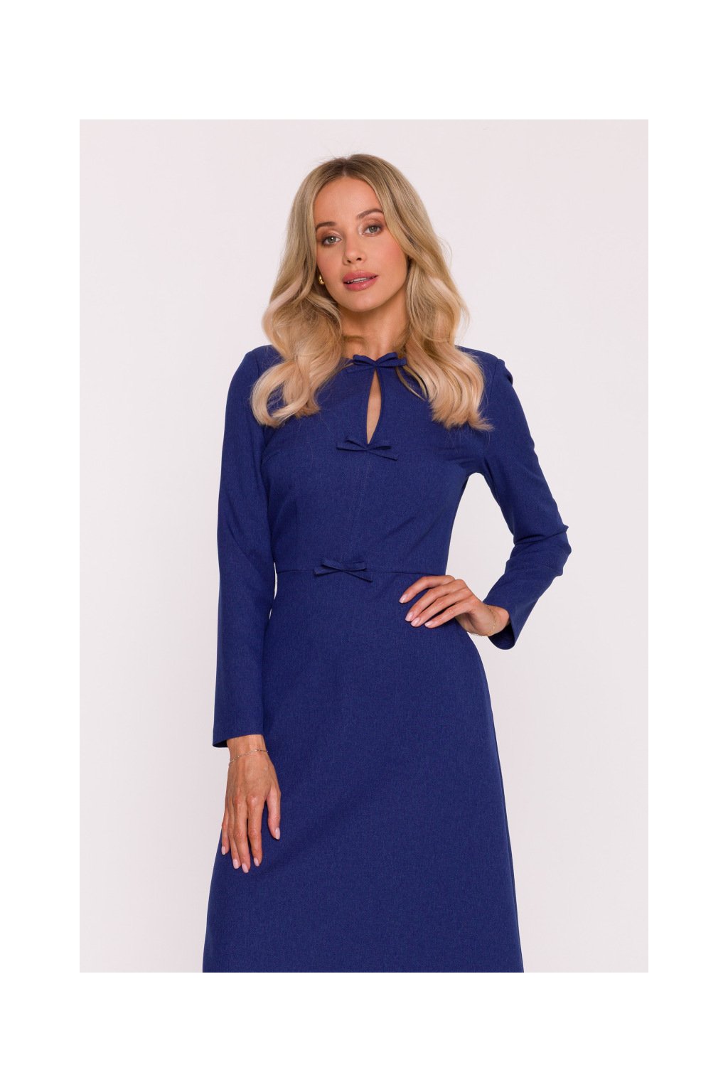 Elegantní šaty v trapézovém střihu představují dokonalou kombinaci pohodlí a stylu. Tvarovaný top je zdobený jemnými mašličkami na přední části, které dodávají šatům ženský a romantický nádech. Dlouhé rukávy zajišťují eleganci a vhodnost pro chladnější dny.