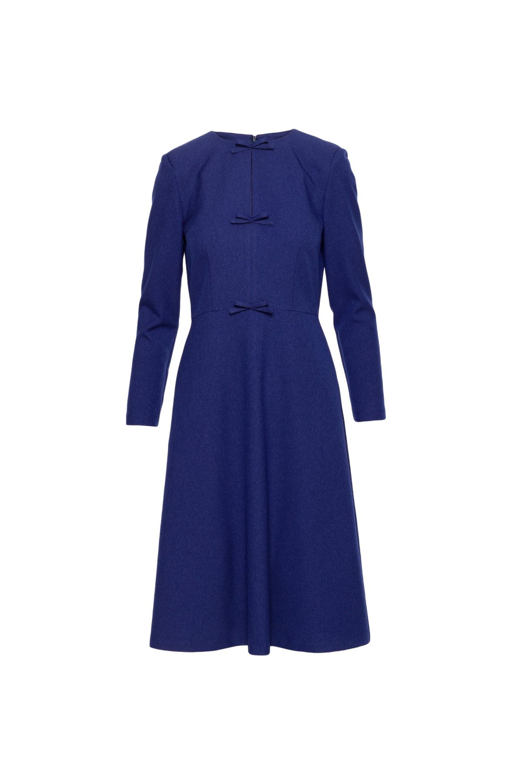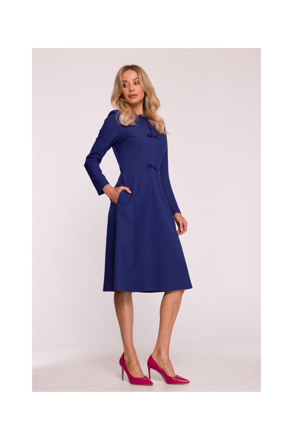 Elegantní šaty trapézového střihu, tvarovaný top s ozdobnými mašličkami vpředu, dlouhým rukávem, pase přestřižené, zapínání na skrytý zip na zádech. Áčková zvlněná vzdušná sukně, v postranních švech skryté kapsy. Hladký materiál s melírovanou strukturou. Bez podšívky.