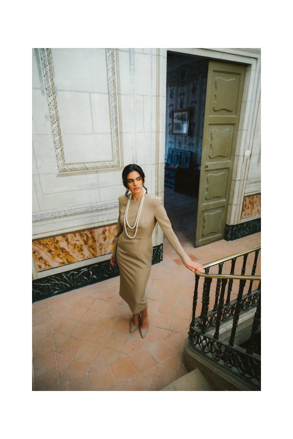 Šaty mají výrazná nabíraná ramena, která opticky modelují postavu a dodávají outfitu originální a stylový výraz. Dlouhé rukávy zajišťují decentní a nadčasový vzhled. Model je v pase přestřižený, což zvýrazňuje ženské křivky a vytváří elegantní siluetu. Praktické zapínání na skrytý zip na zádech je diskrétní a neruší celkový vzhled šatů. Úzká pouzdrová sukně perfektně kopíruje postavu a působí velmi sofistikovaně. V zadní části sukně se nachází rozparek, který usnadňuje pohyb a zároveň přidává šatům jemný nádech smyslnosti. Hladký materiál s melírovanou strukturou vyniká svou jemností a lehce zajímavým povrchem, což podtrhuje luxusní vzhled modelu. Šaty jsou plně podšité, což zajišťuje pohodlí při nošení a zároveň zvyšuje kvalitu zpracování.