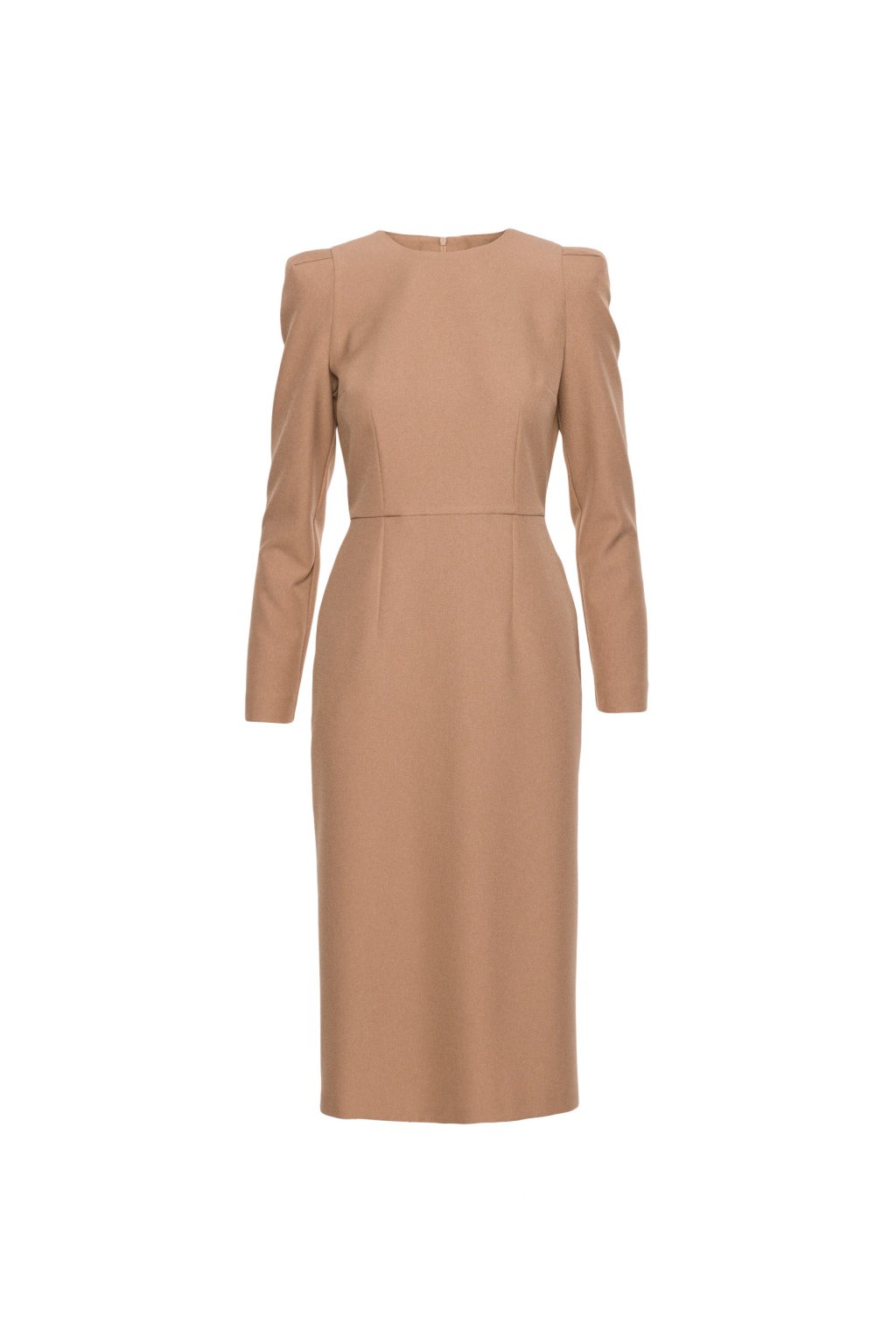 Elegantní šaty pouzdrového střihu, top s výraznými nabíranými rameny, dlouhým rukávem, pase přestřižené, zapínání na skrytý zip na zádech. Úzká pouzdrová sukně, vzadu rozparek. Hladký materiál s melírovanou strukturou. Plně podšité.