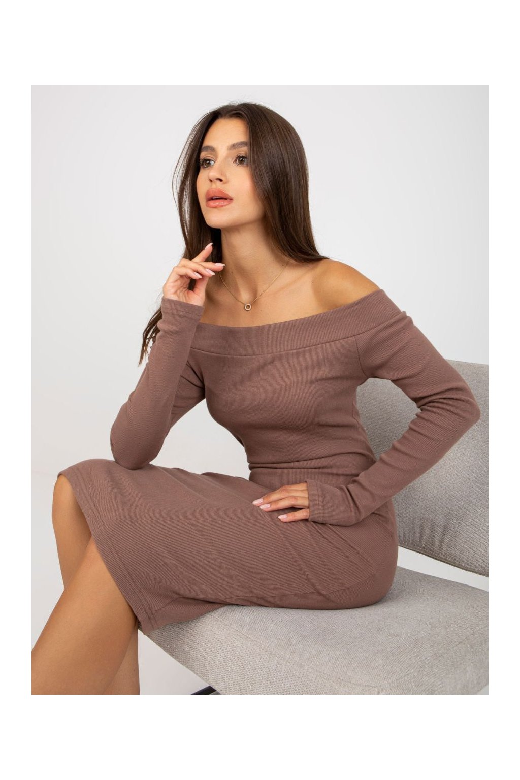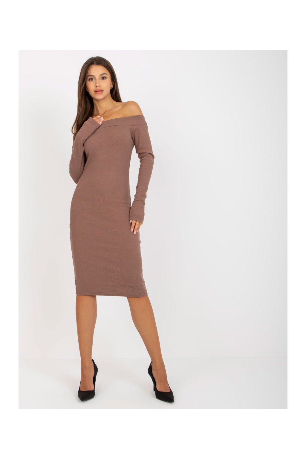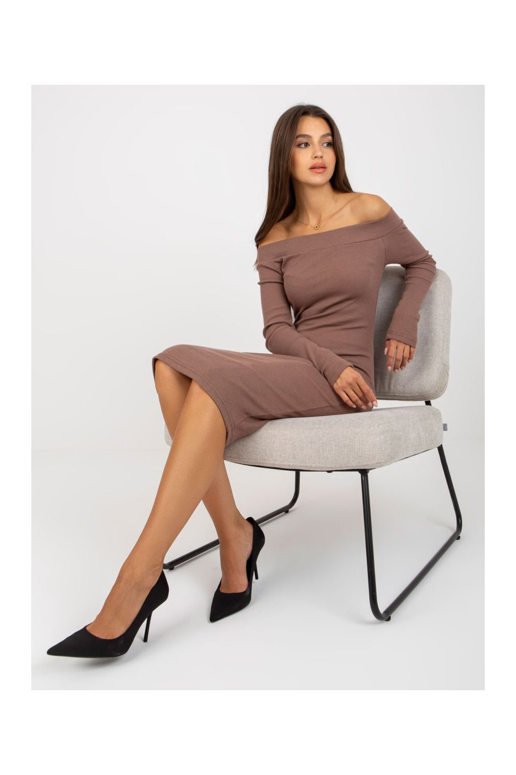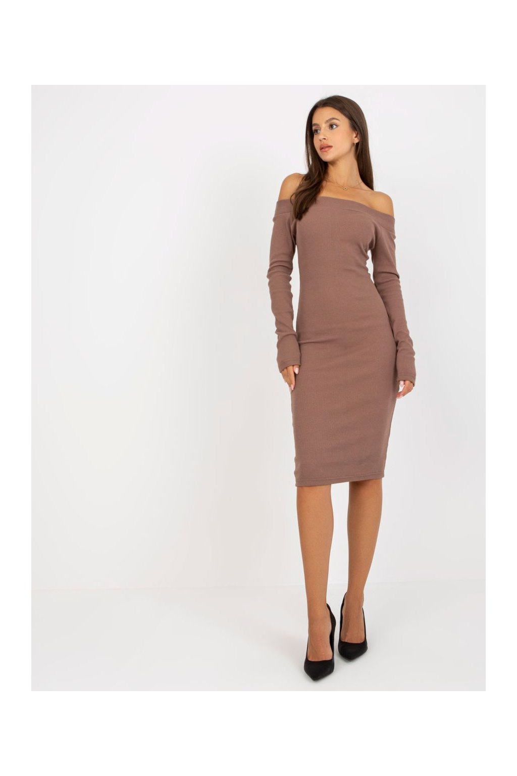 Bavlněné pouzdrové šaty z vroubkovaného materiálu. Pružný materiál kopíruje a zdůrazňuje postavu. Výstřih typu carmen, délka ke kolenům.