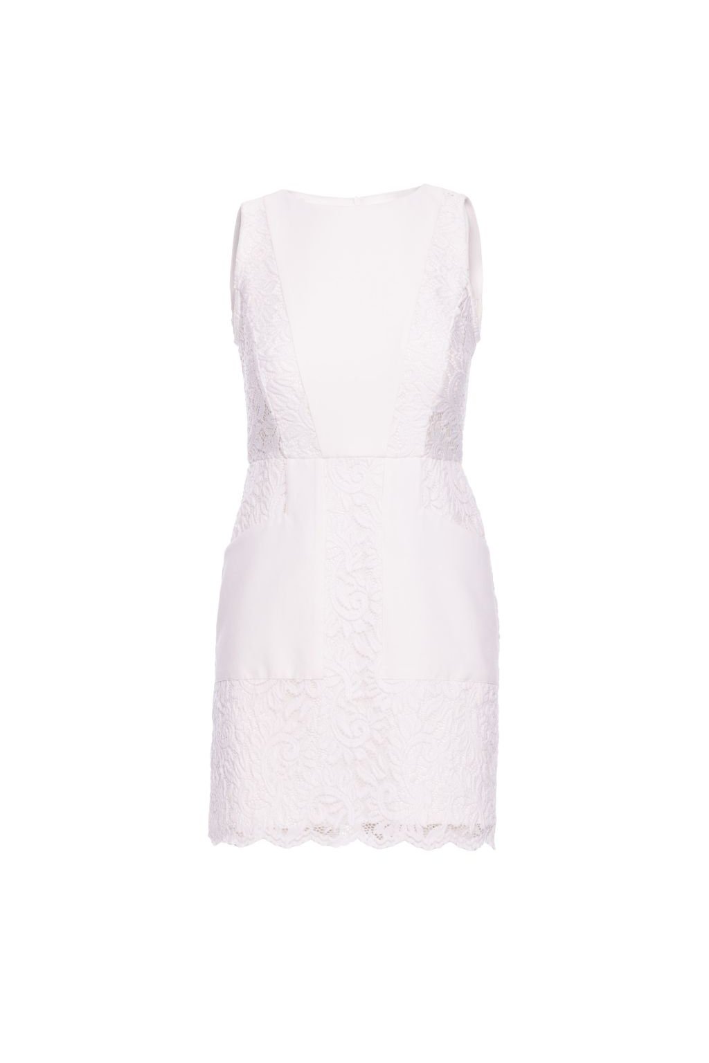 Slavnostní společenské minišaty, vypasovaný pouzdrový střih, úzká sukně nad kolena, ozdobné krajkové vsadky. Kulatý výstřih, zapínání na skrytý zip na zádech.