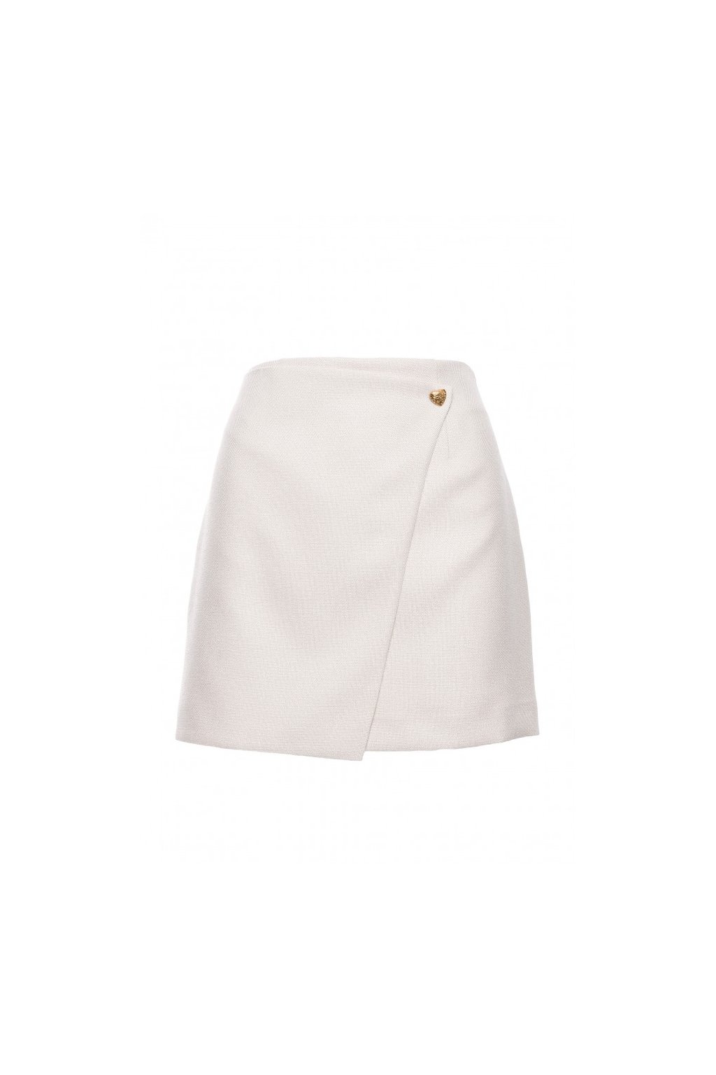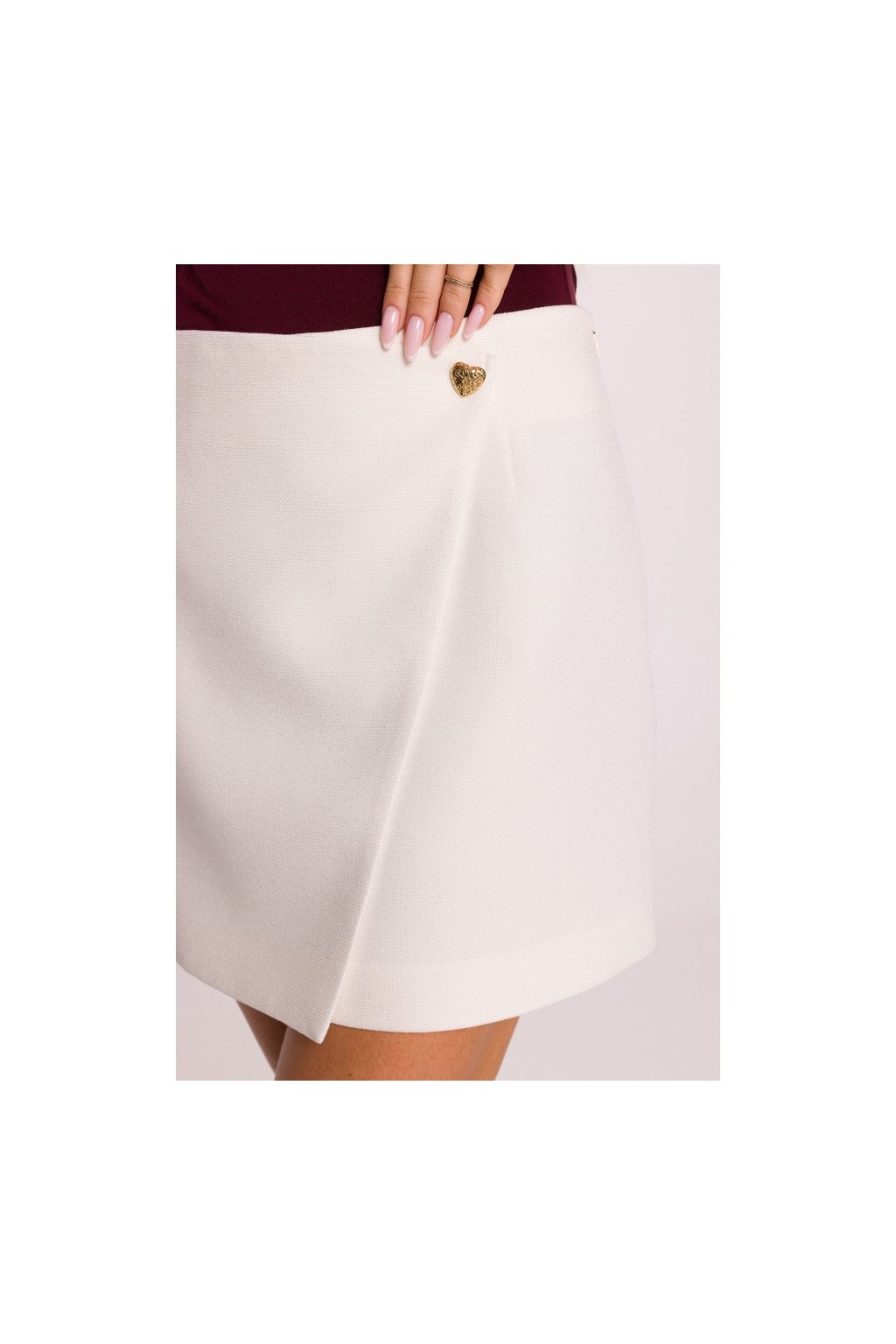 Elegantní dámská minisukně k saku Moe M853. Zavinovací střih, plně podšitá, zapínání na výrazný zlatý knoflíček ve tvaru srdce, který ladí se sakem. Zapínání na skrytý zip.