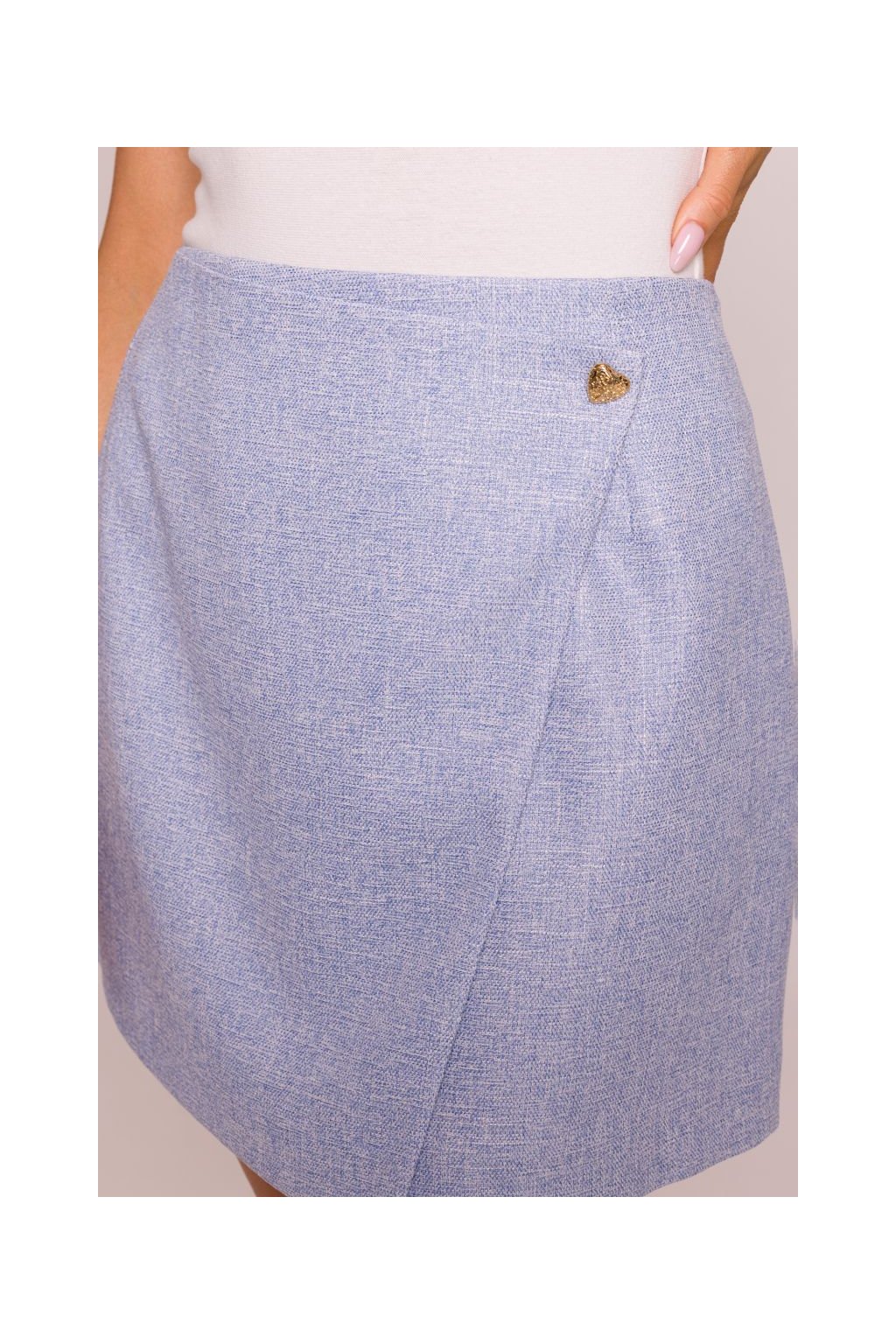 Elegantní dámská minisukně k saku Moe M853. Zavinovací střih, plně podšitá, zapínání na výrazný zlatý knoflíček ve tvaru srdce, který ladí se sakem. Zapínání na skrytý zip.