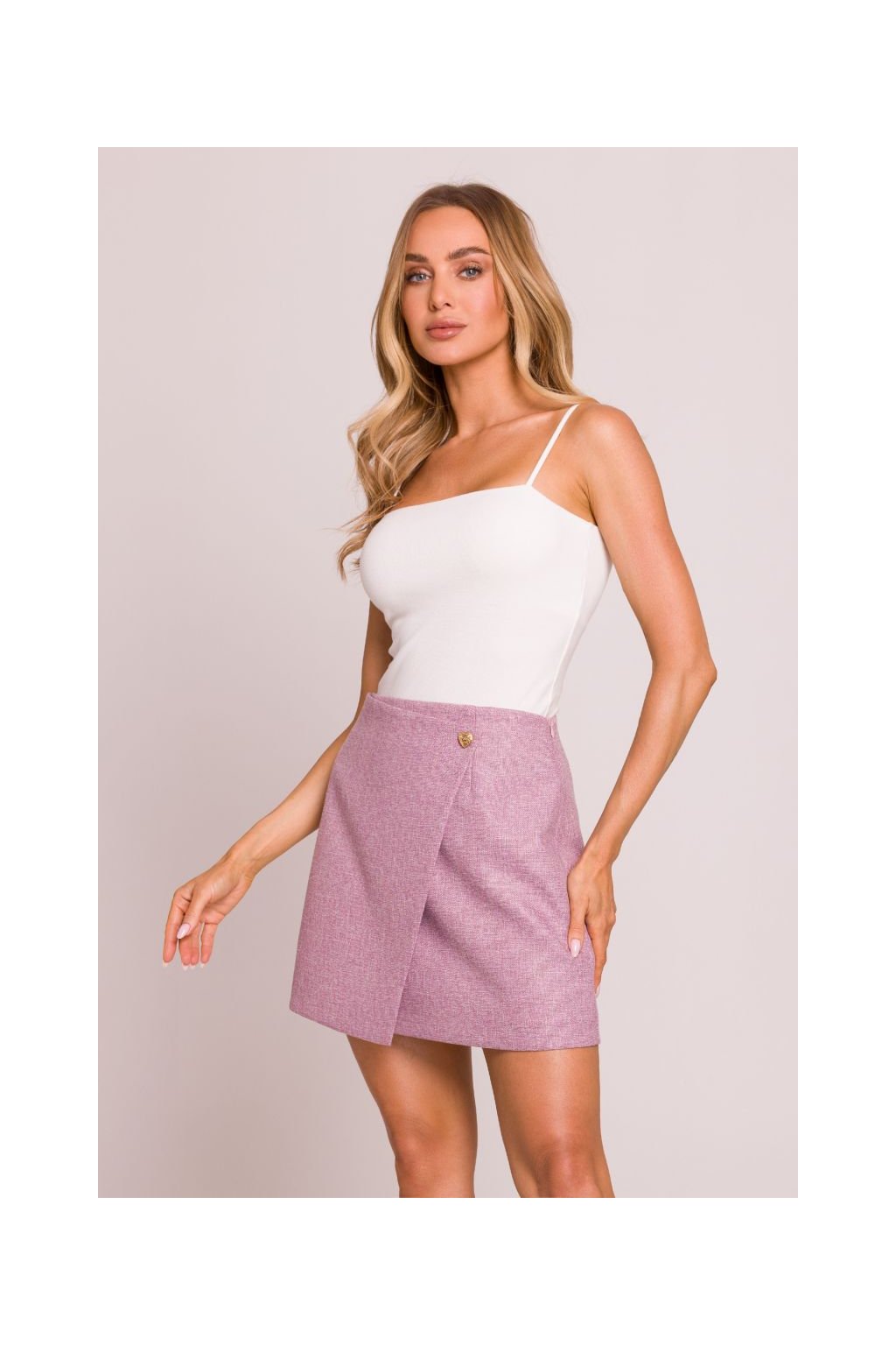Elegantní dámská minisukně k saku Moe M853. Zavinovací střih, plně podšitá, zapínání na výrazný zlatý knoflíček ve tvaru srdce, který ladí se sakem. Zapínání na skrytý zip.