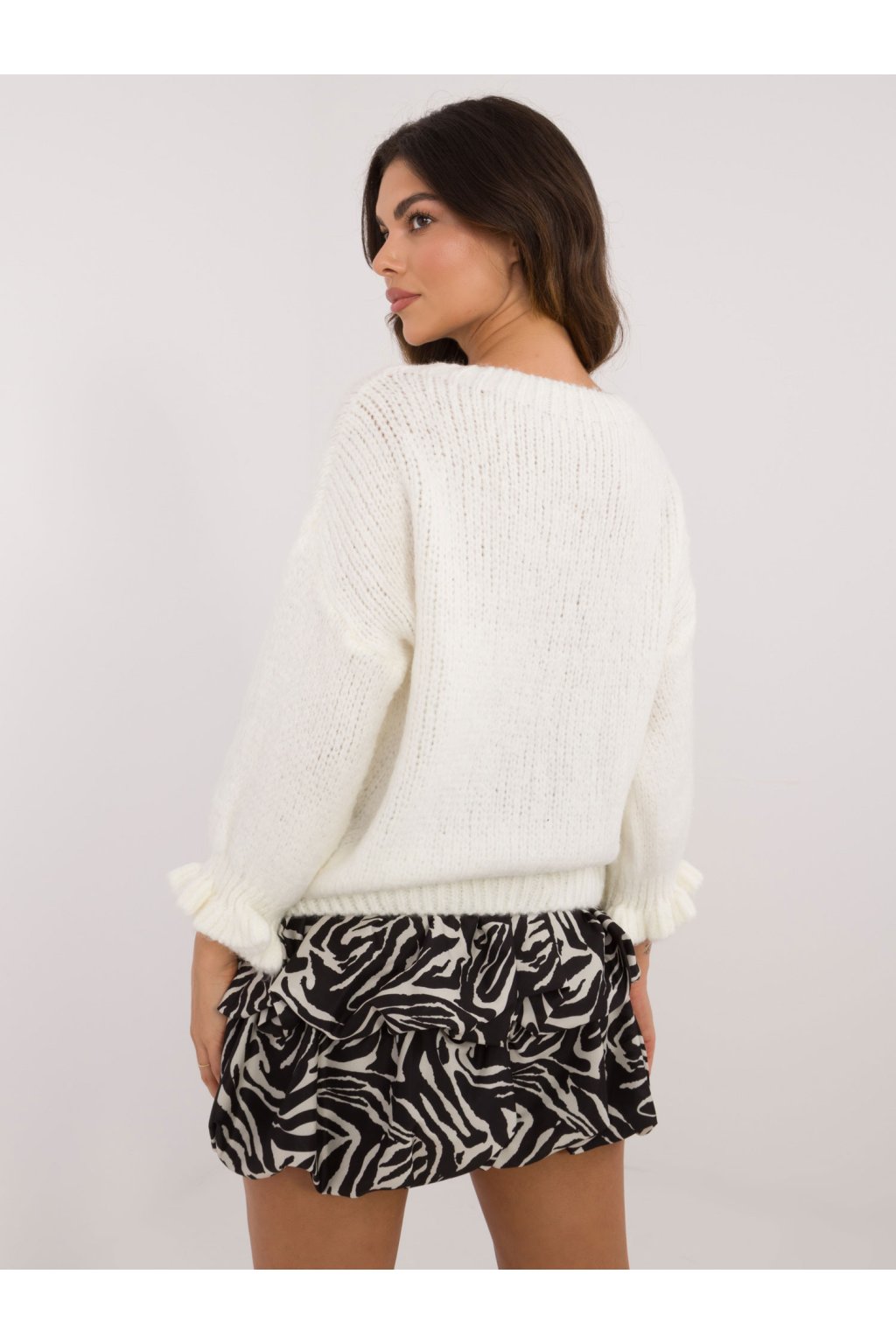 Jarní svetr z hrubého úpletu se zajímavým detailem volánku na rukávu.