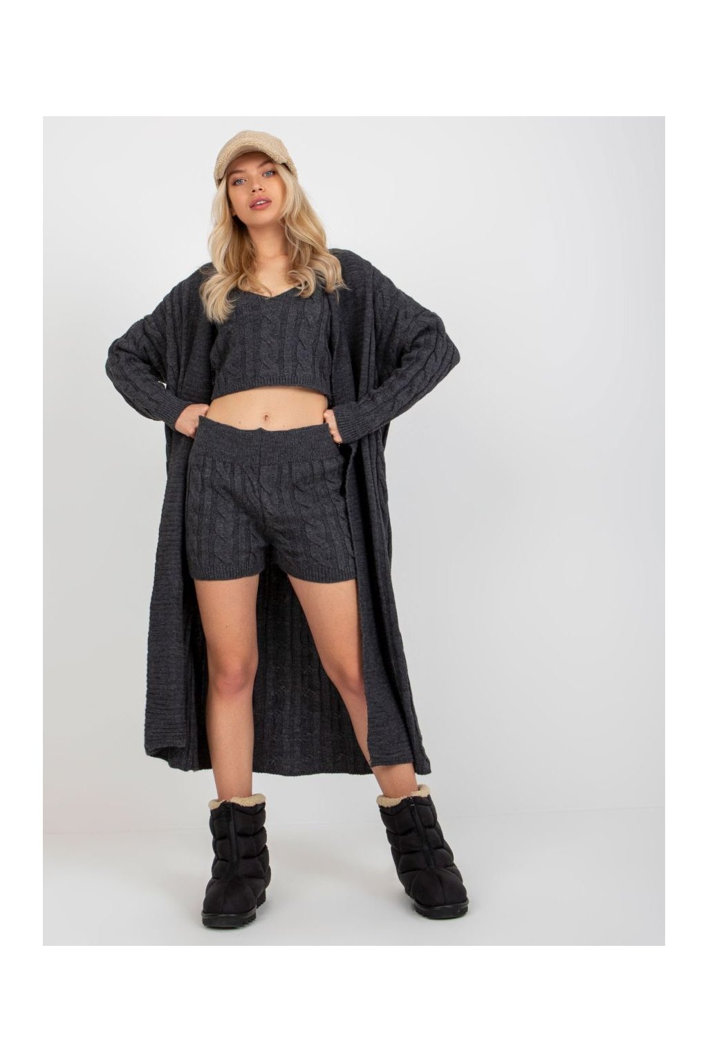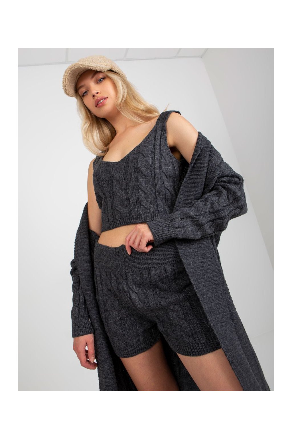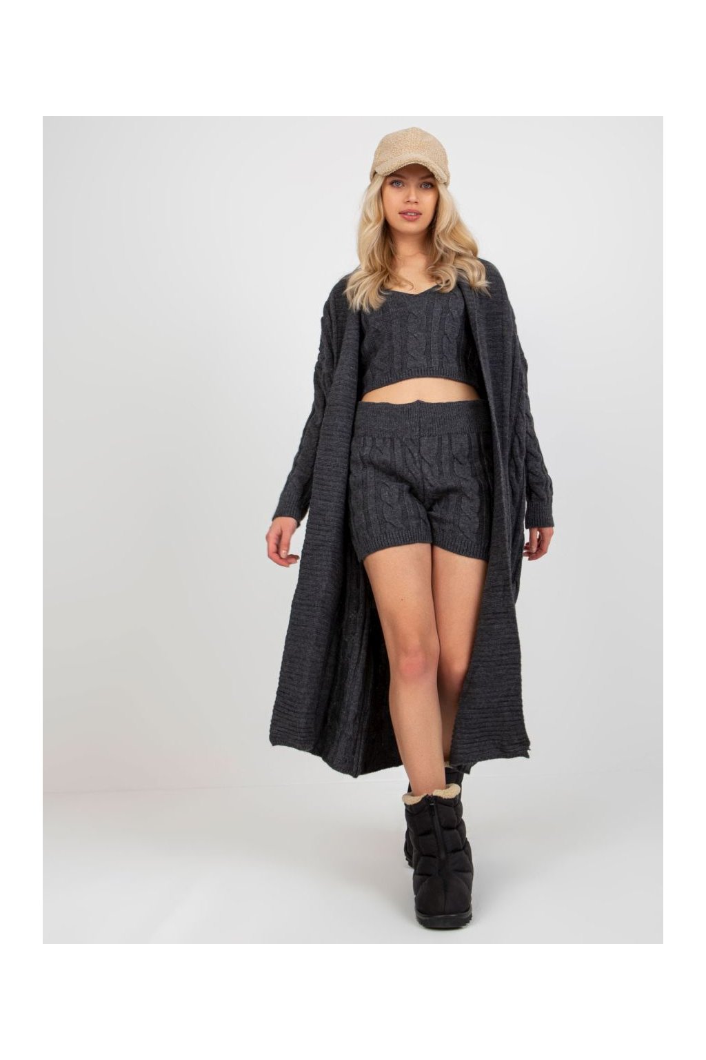 Třídílný pletený komplet sestávající z dlouhého pohodlného pleteného kabátku s výrazným copánkovým vzorem, krátkého pleteného topu na ramínka a pletených kraťasů.