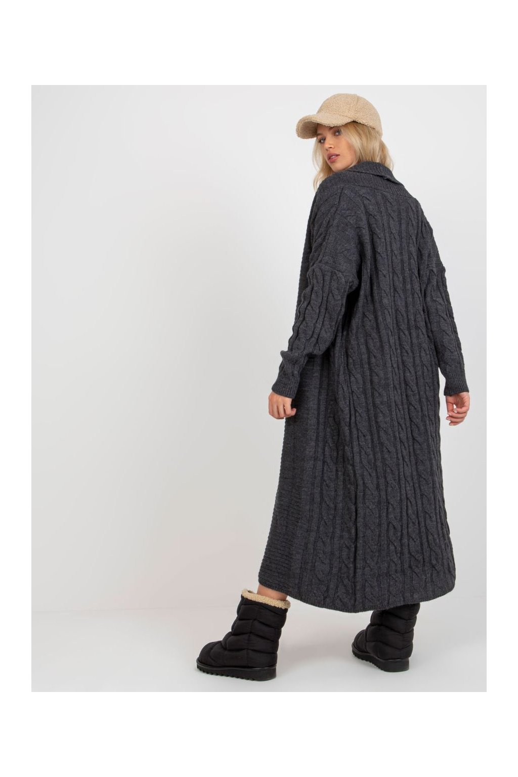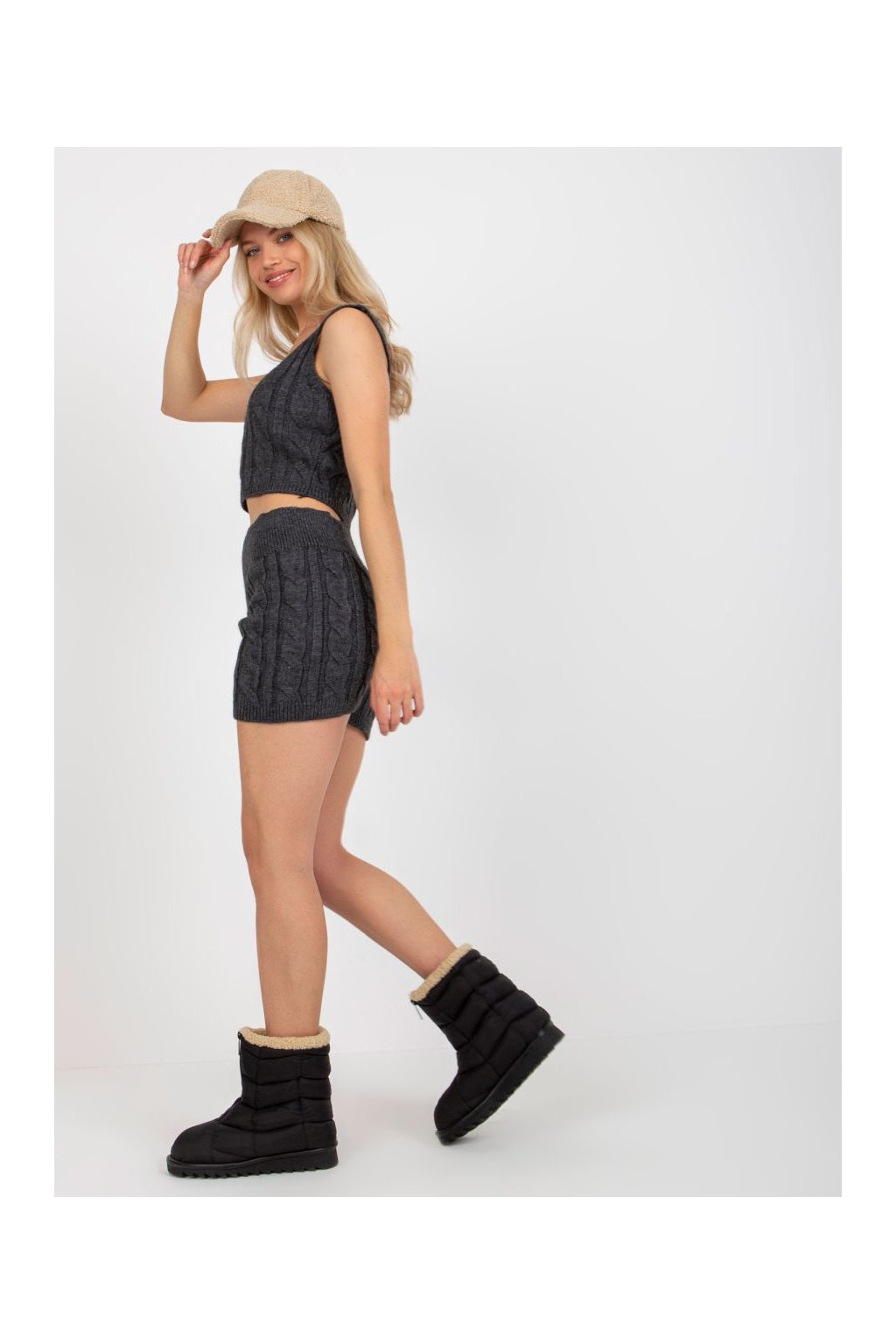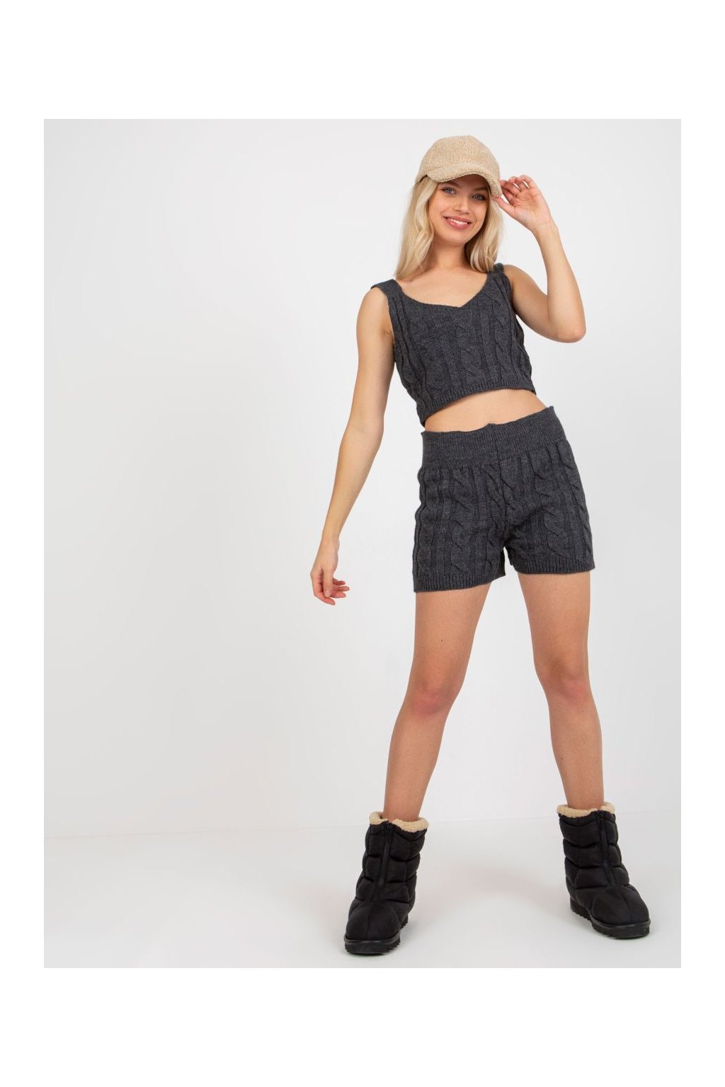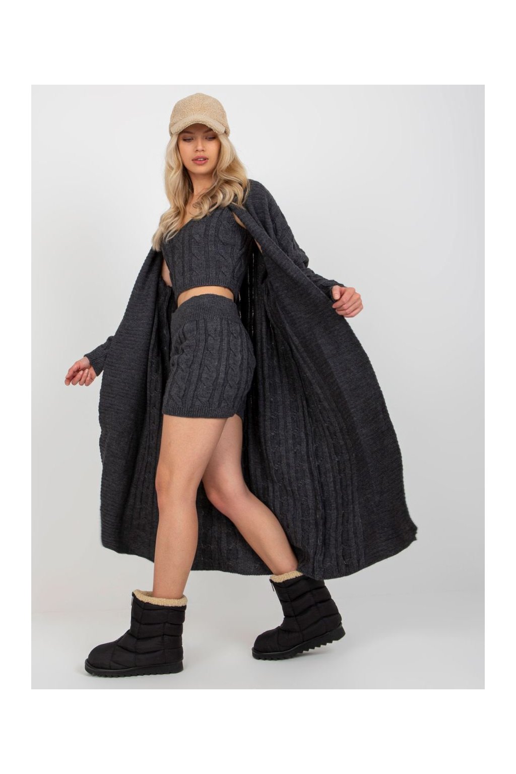 Třídílný pletený komplet sestávající z dlouhého pohodlného pleteného kabátku s výrazným copánkovým vzorem, krátkého pleteného topu na ramínka a pletených kraťasů.